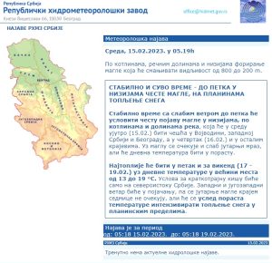 Stabilno vreme sa slabim vetrom do petka će usloviti čestu pojavu magle u nizijama, po kotlinama i dolinama reka, koja je ovog jutra češća u Vojvodini, zapadnoj Srbiji i Beogradu, a u četvrtak očekuje se i u ostalim krajevima. Uz maglu se očekuje i slab jutarnji mraz, ali će dnevna temperatura biti u porastu.