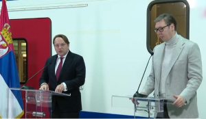 Predsednik Republike Srbije Aleksandar Vučić dočekao je oko 12 časova na stanici Prokop komesara Evropske unije za susedsku politiku i proširenje Olivera Varheljija.